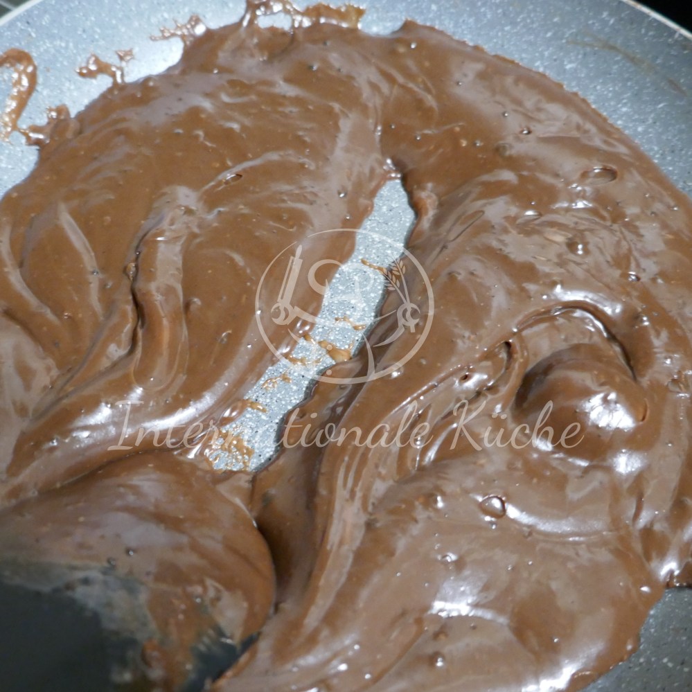 Auch die Zubereitung ist ganz einfach. Einfach eine Pfanne auf den Herd stellen und alle Zutaten zusammen in diese geben (Backkakao bitte vorher sieben). Die Mischung ständig rühren, bis sie nicht mehr zusammen läuft, wenn man mit einem Teigschaber einmal durch die Mischung zieht. Dies kann einige Minuten dauern.