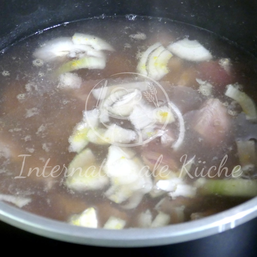Das Rindfleisch wird mit einem Würfel bzw. 1 EL Gemüsebrühe und der Hälfte der Zwiebel in Wasser gekocht, bis es durch ist. Das kann je nach Fleisch ein bisschen dauern.
