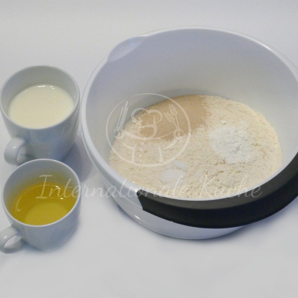 Die Milch wird leicht erwärmt, alle trockenen Zutaten miteinander vermischt. Das Öl sollte Zimmertemperatur haben. Nachdem alle trockenen Zutaten gut vermischt sind, werden Milch und Öl dazu gegeben. Der Teig sollte mindestens 10 Minuten lang geknetet werden, bis er schön zusammen kommt. Danach sollte er so lange gehen, bis er die doppelte Größe hat.