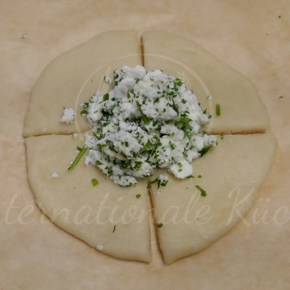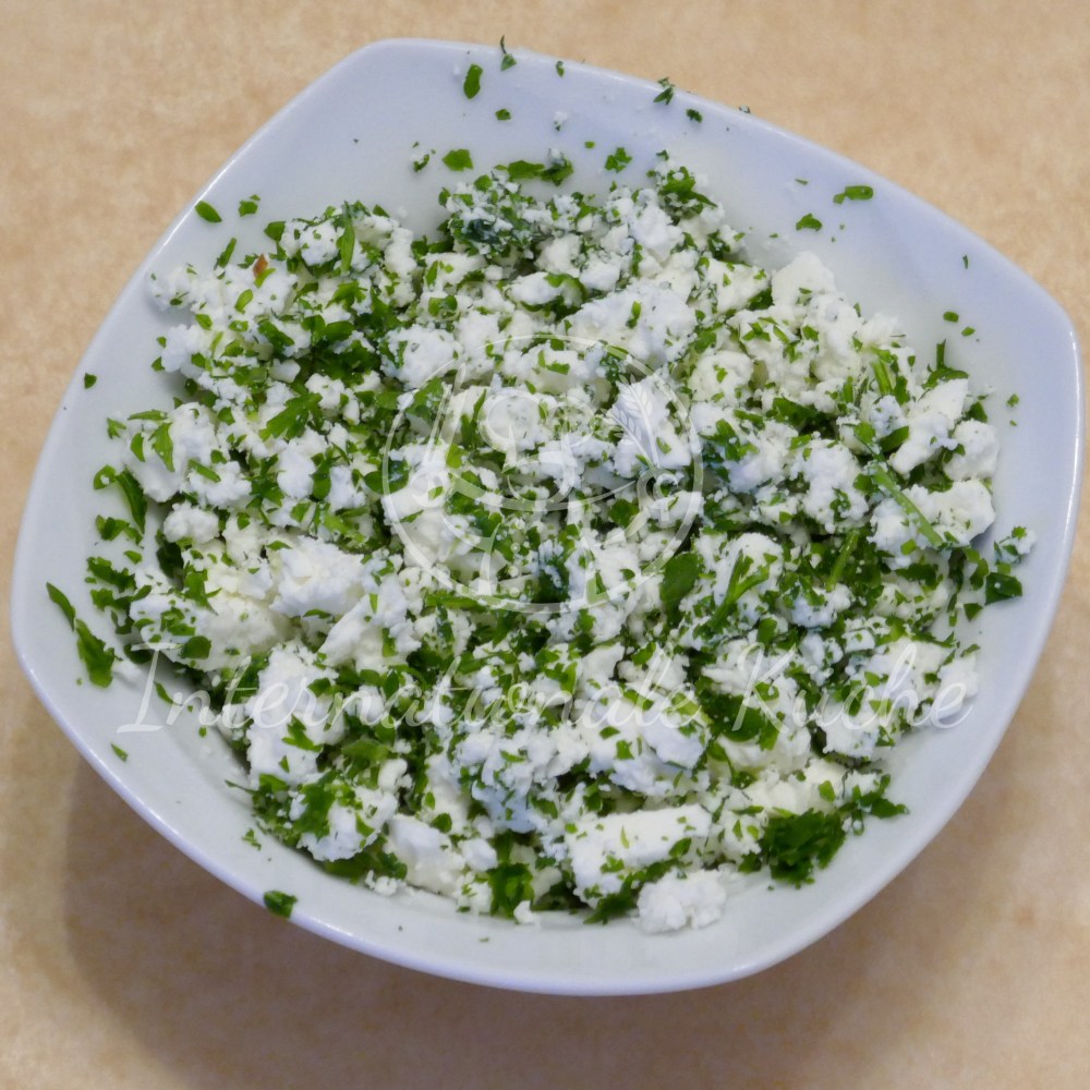Der Schafskäse wird einfach mit der Gabel zerdrückt. Frische Petersilie wird gewaschen, geschnitten und dann mit dem Schafskäse vermischt, während gefrorene Petersilie einfach mit dem Schafskäse vermischt wird.