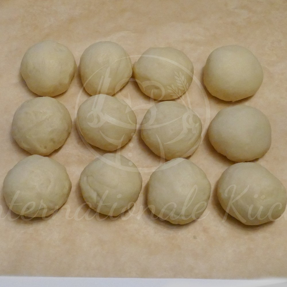 Sobald sich der Teig verdoppelt hat, wird er nochmal gut durchgeknetet und in zwölf gleich große Stücke geteilt.