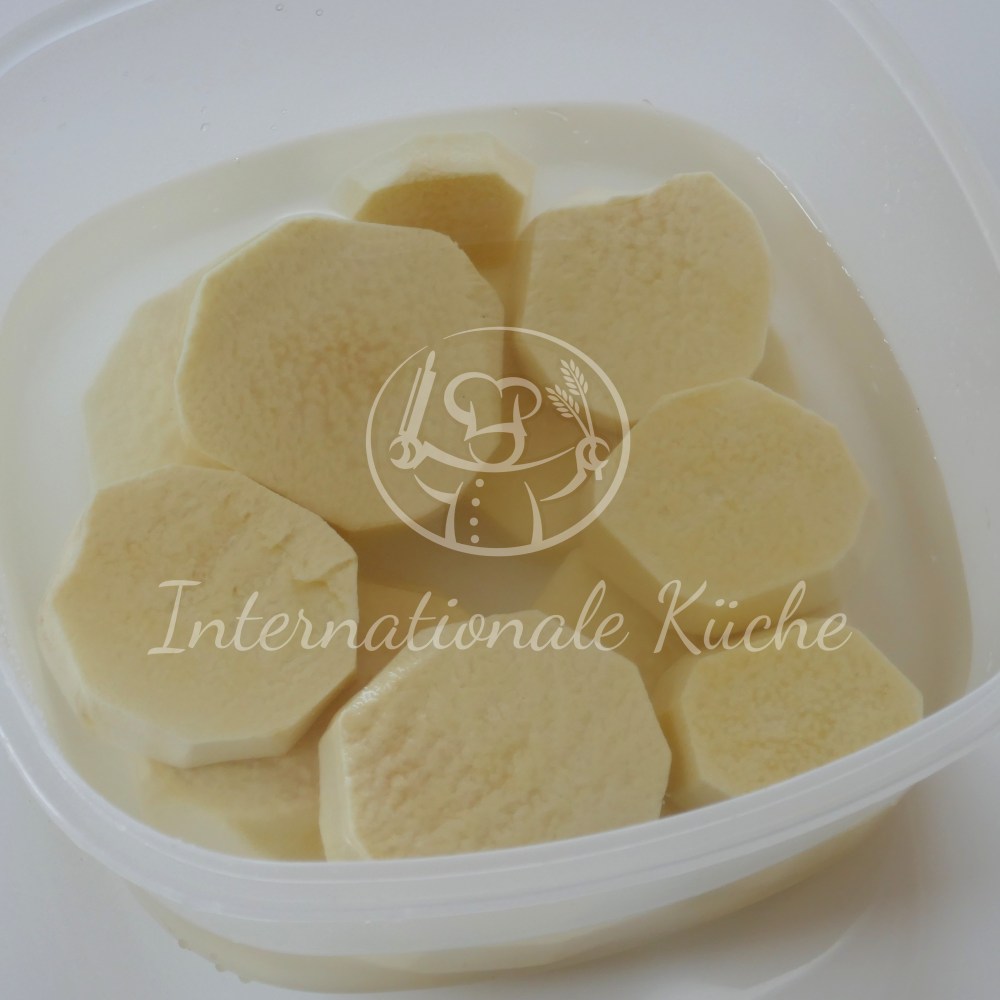 Die Yamswurzel wird dann in einem Topf mit Wasser (ohne Salz!) gekocht, bis sie weich ist. Achtet darauf, dass sie immer mit Wasser bedeckt ist, sonst färbt sie sich dunkel. Ist zwar nicht schlimm, kennt man ja von Kartoffeln, aber sieht einfach nicht sehr schön aus.