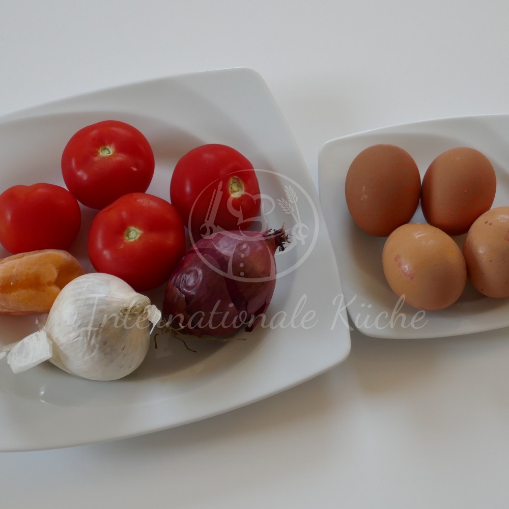 Alles wird gewaschen und klein geschnitten und kommt dann schon mit etwas Pflanzenöl in die Pfanne. Sobald das Gemüse weich geworden ist und die Flüssigkeit aus den Tomaten ein bisschen verdunstet ist, werden in einem anderen Teller die Eier verquirlt und gesalzen.
