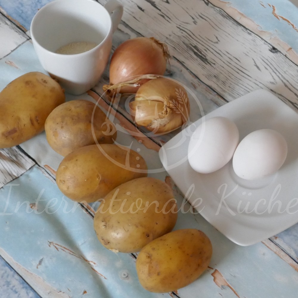 Danach kommen die Kartoffeln erst einmal in eine Schüssel, denn jetzt sind die anderen Zutaten dran. Die zwei Zwiebeln werden gerieben oder sehr klein geschnitten, je nachdem, was euch lieber ist, und dann zu den Kartoffeln gegeben. Die beiden Eier sowie das Paniermehl werden auch direkt zu den Kartoffeln gegeben.