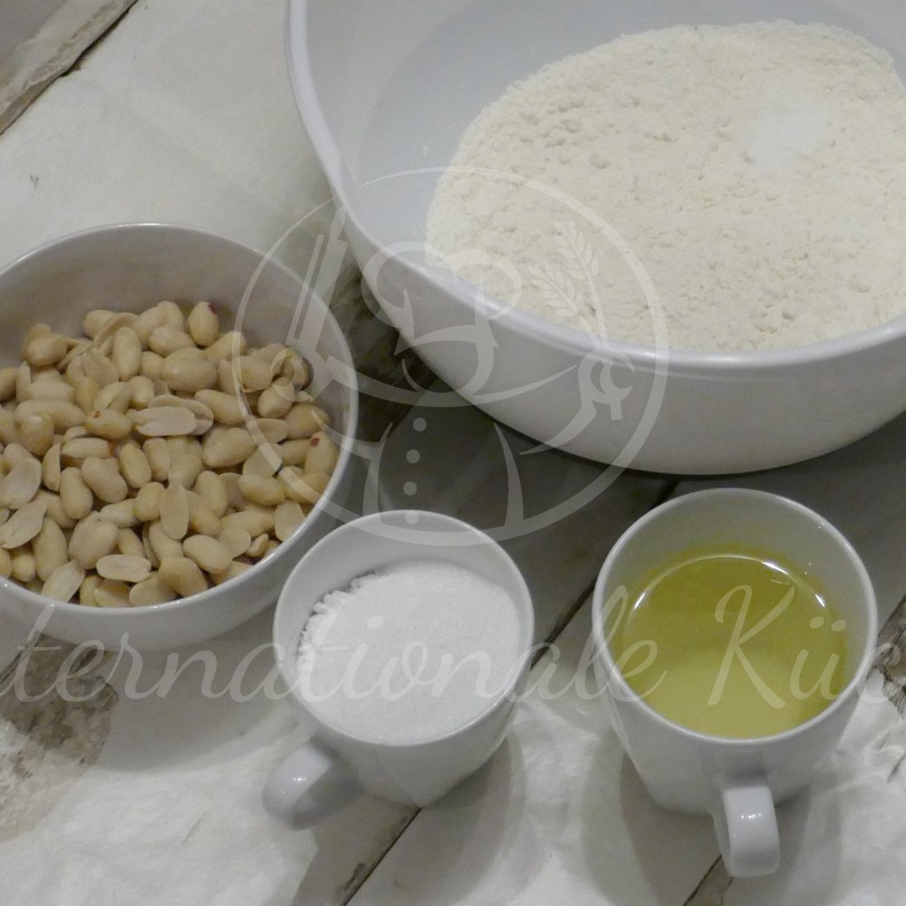 Auch in China werden gerne Plätzchen gebacken. Ein leckeres Beispiel dafür sind diese Erdnussplätzchen, die nicht nur schnell gehen, sondern auch besonders stark nach Erdnuss schmecken – denn sie enthalten nicht nur frische Erdnüsse, sondern auch Erdnussöl.