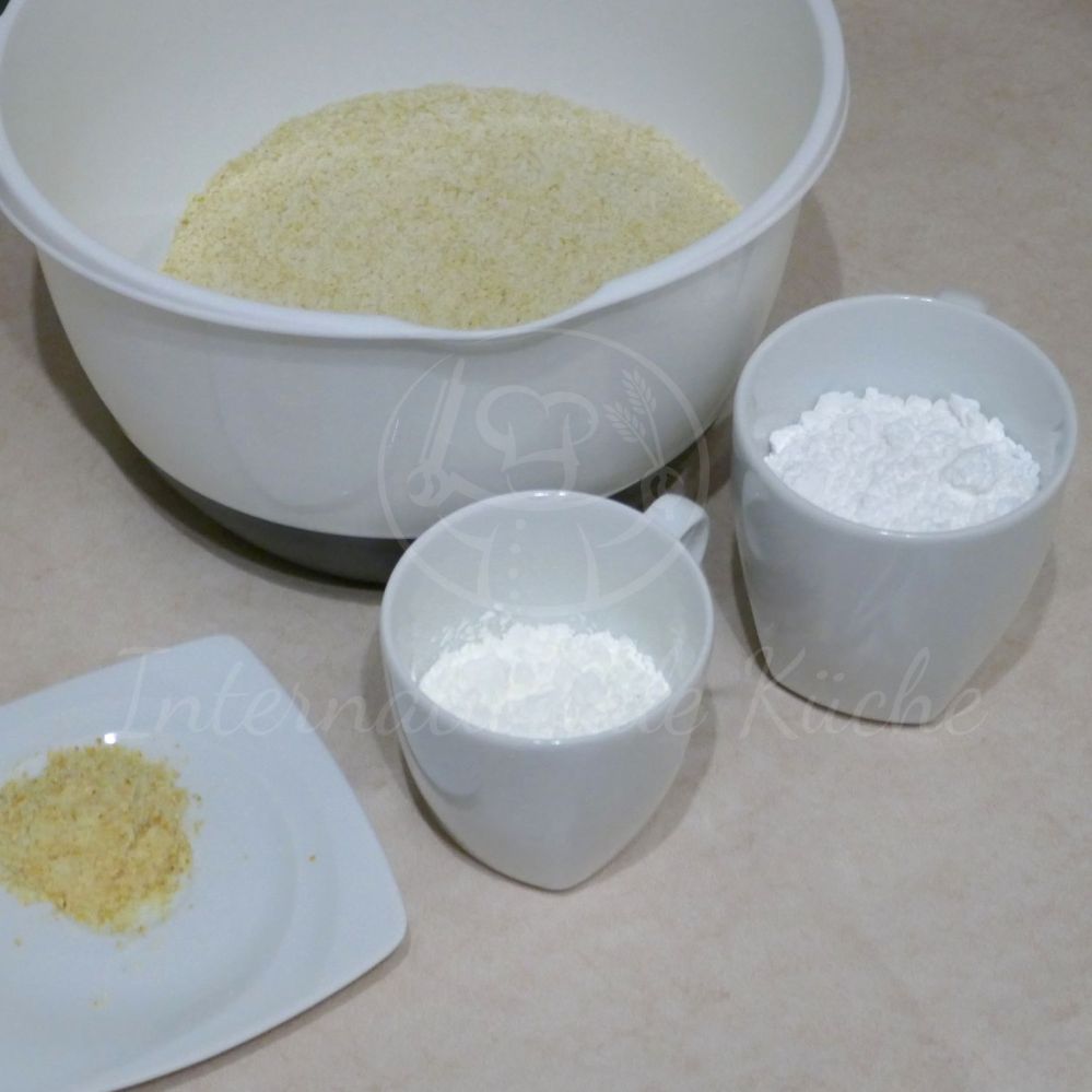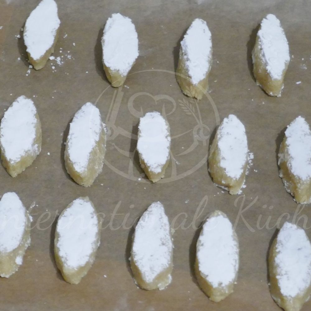 Diese kleinen Teilchen werden nun in die Form von überdimensional großen „Reiskörnern“ gebracht, die noch vor dem Backen an der Oberseite dick mit Puderzucker verziert werden. So kommen die Ricciarelli dann auch schon in den Ofen und werden bei 180 Grad Ober-/Unterhitze gebacken, bis sie eine schöne Farbe haben.
