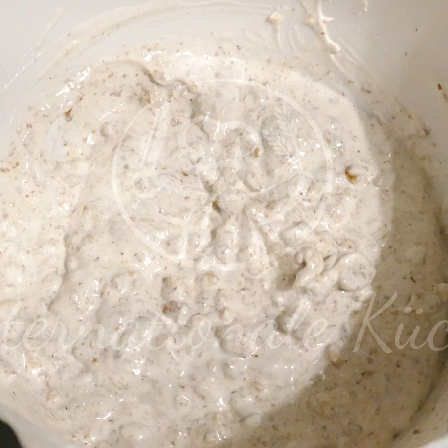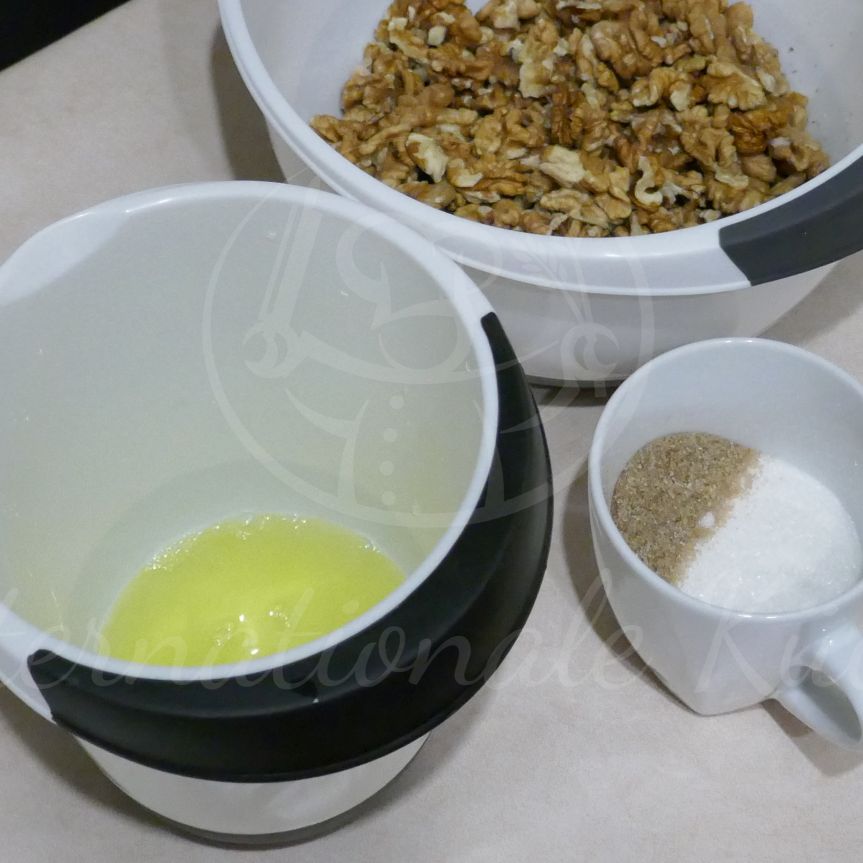 Das Eiweiß wird mit dem Mixer aufgeschlagen, während nach und nach Zucker und Vanillezucker dazu gegeben werden. Sobald das Eiweiß steif ist, werden vorsichtig die zerkleinerten Walnüsse untergehoben. Auch falls das Eiweiß trotz längerem Aufschlagen nicht ganz steif wird, ist das kein Problem, da die Makronen durch die Walnüsse trotzdem an Stabilität erhalten. Aber flüssig sollte das Eiweiß auf keinem Fall mehr sein.