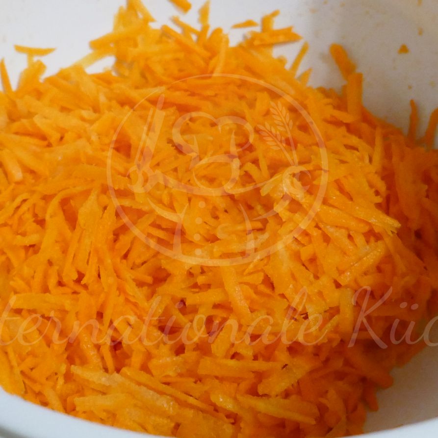 Zuerst werden die Karotten gewaschen, geschält und gerieben.