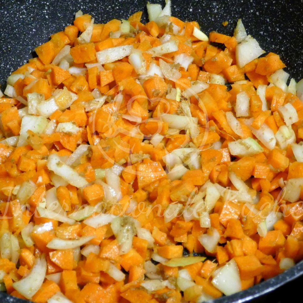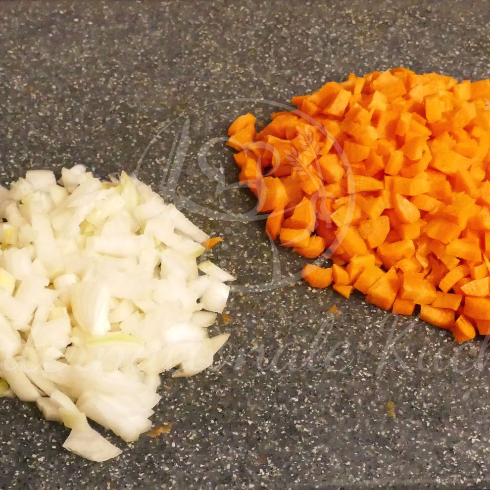 Währenddessen wird in einer Pfanne etwas Öl erhitzt. Die Karotten werden geschält und klein geschnitten, wie auch die Zwiebel.
