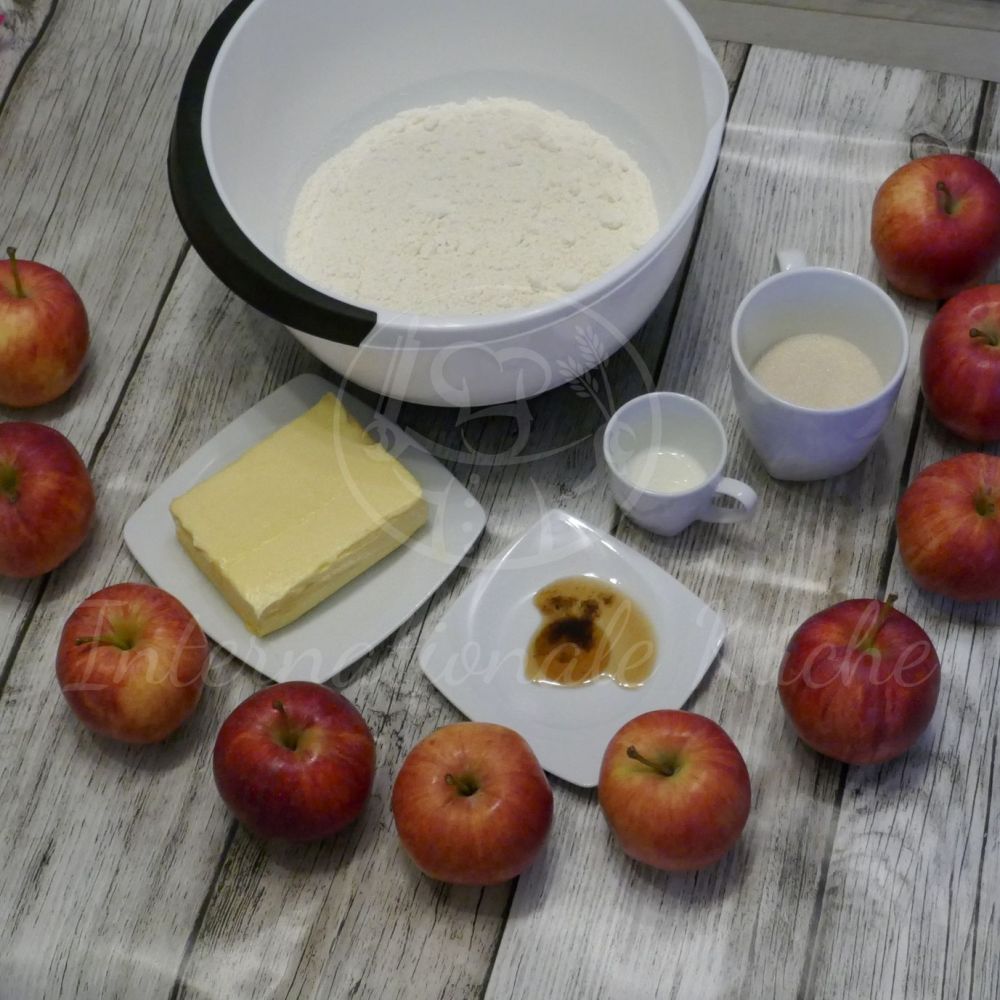 Aus Mehl, Butter, Zucker, Vanille, Milch und Salz wird ein Teig hergestellt, der dann einige Minuten ruhen sollte. Währenddessen werden alle Äpfel gewaschen, geschält und in dünne Spalten geschnitten, die dann mit dem Zimt vermischt werden.