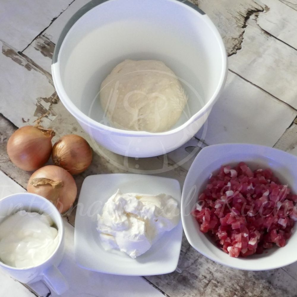 Die Zwiebeln werden klein geschnitten und in etwas Öl angebraten. Dann kommt auch der Speck dazu und wird mit angebraten. Währenddessen werden Schmand, Quark, Muskat, Salz und Pfeffer vermischt.