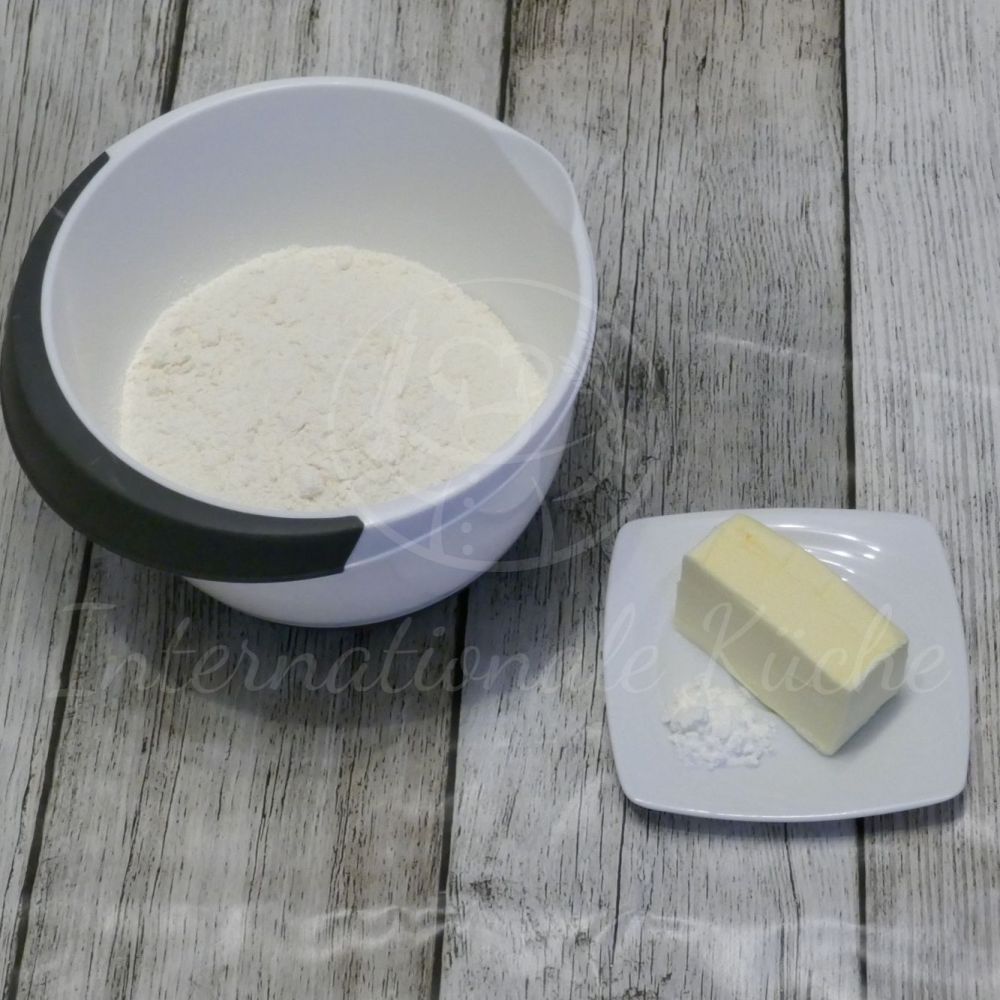 Aus Mehl, Backpulver, Butter und Wasser wird ein Teig hergestellt, der dann etwas ruhen darf.