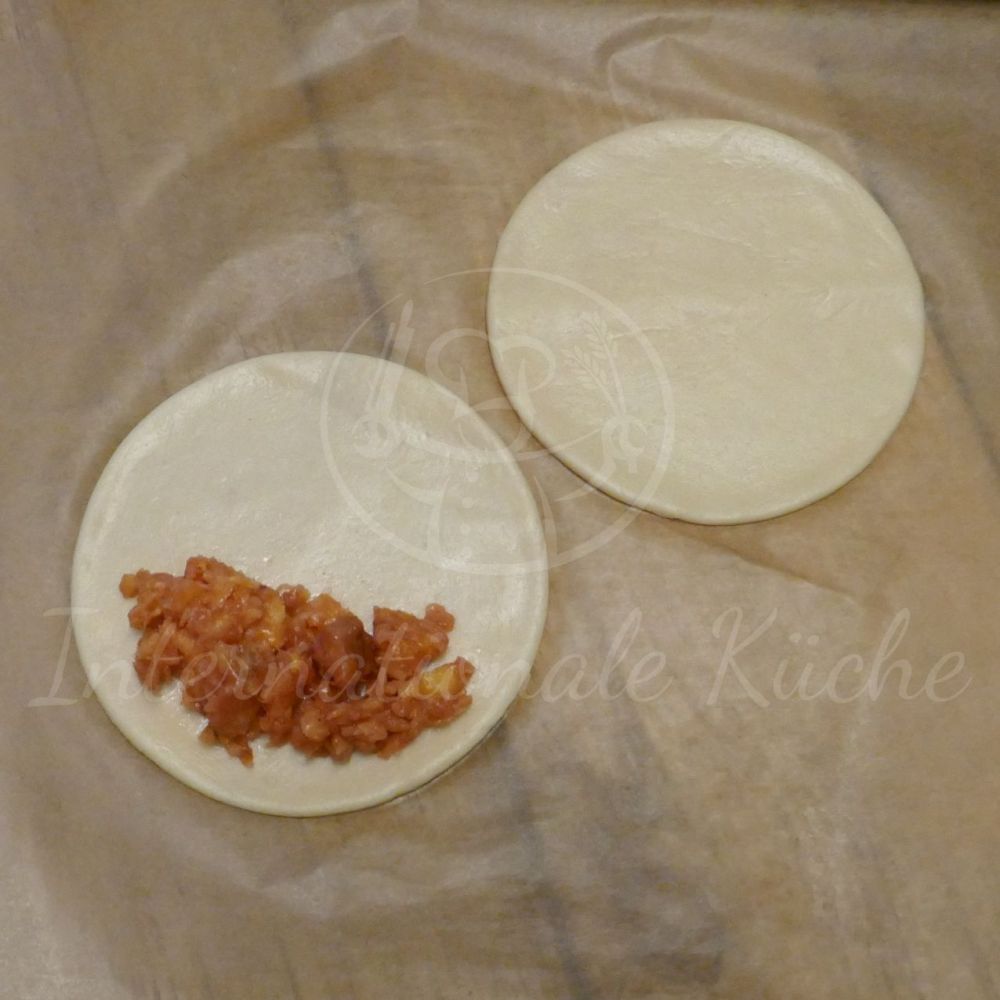 Der Teig wird ausgerollt. Es werden mit einem Ausstecher oder einem Glas runde Kreise ausgestochen, von denen jeweils die Hälfte mit der Füllung gefüllt wird.