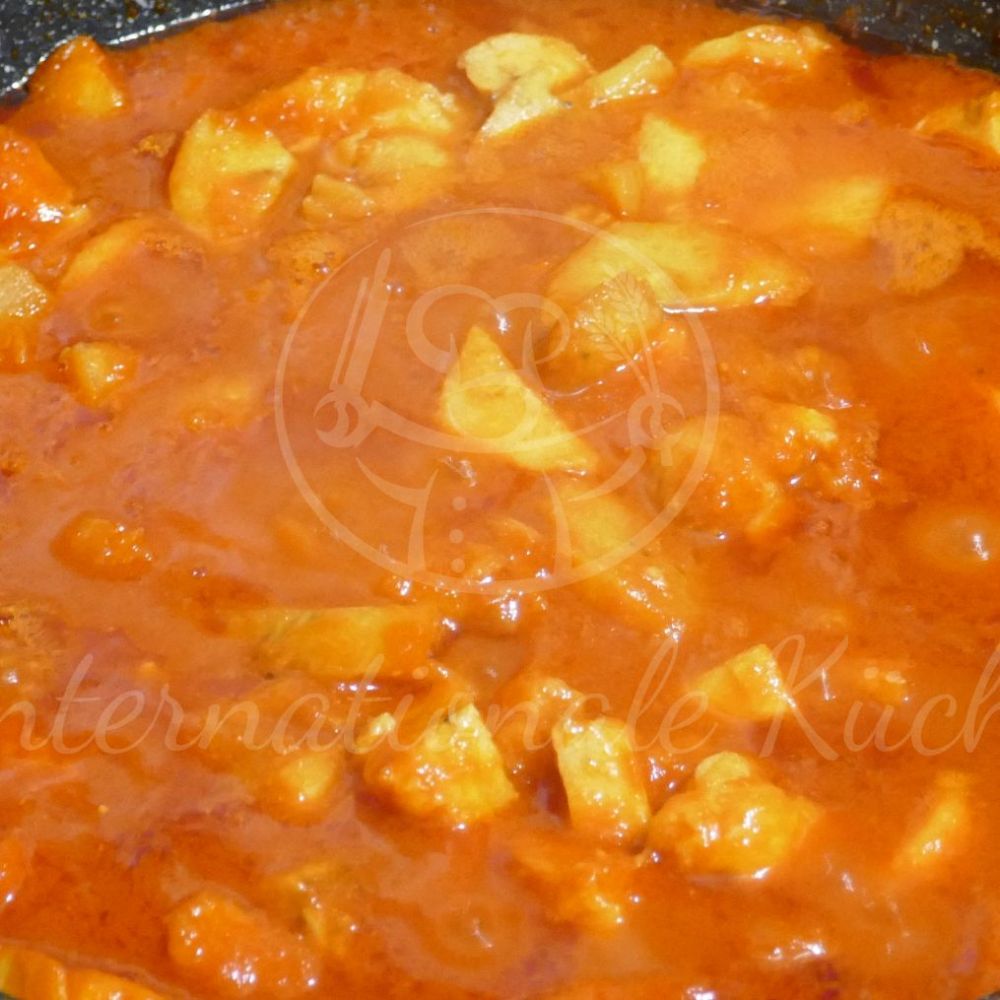Die Zwiebeln werden im Palmöl angebraten, dann kommen die Habanero/Scotch Bonnet, Tomatenmark, Passata, Salz und Pfeffer hinzu und werden mit angebraten. Danach kommen auch schon die Kochbananen in die Pfanne. Mit geschlossenem Deckel wird alles ein bisschen gekocht.